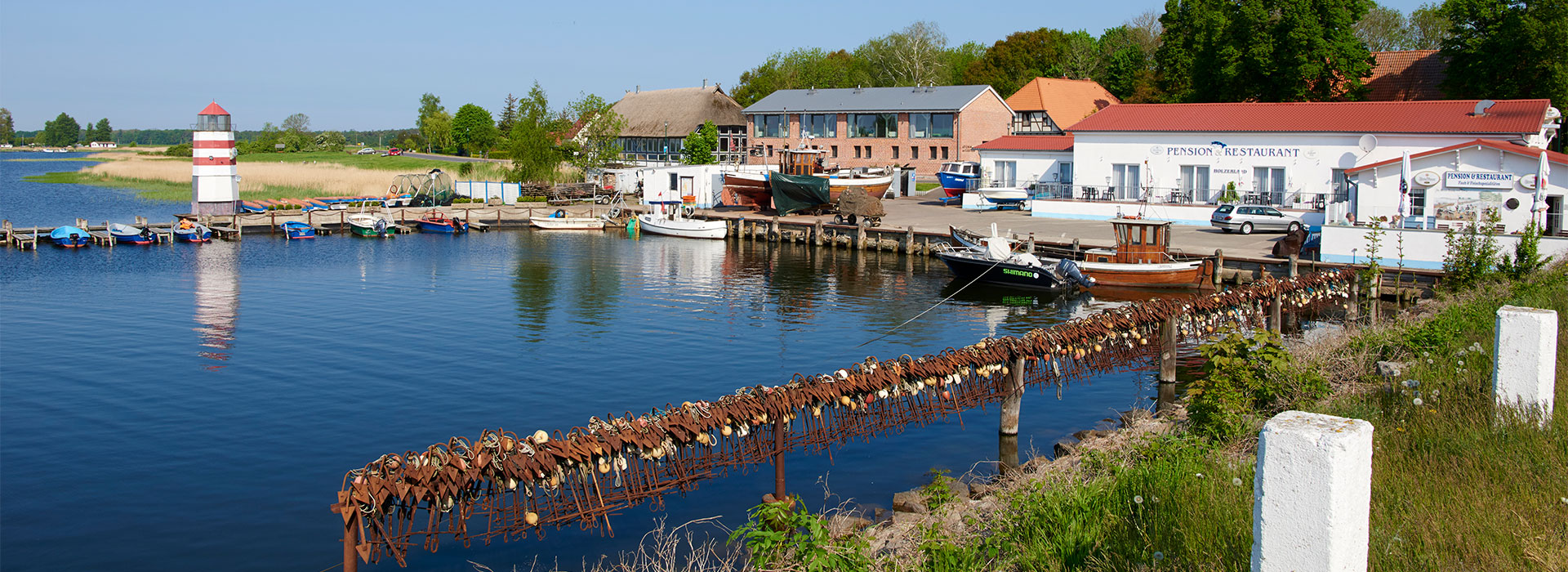 Aber Vorsicht, der Platz ist nicht für jeden zugänglich. „Das Fahrwasser ist 1,80 Meter tief, hier im Hafen bekommen wir Schiffe bis 1,60 Meter unter“, sagt der Besitzer der urigen Hafenanlage. Die besteht aus einer 45 Meter langen, befestigten Kaianlage mit Liegeplätzen auch für Fischer, einem Restaurant, einem Gebäude mit Ferienwohnungen und einem Schuppen mit einem 50 Jahre alten Räucherofen.