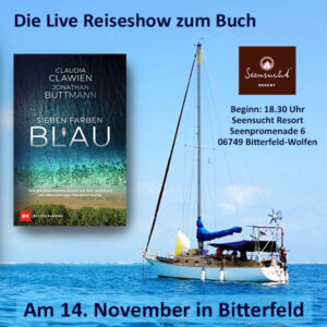 Neben vielen Fotos, Videos, Lesungen und Musik erzählen die beiden auch, wie sie den Absprung aus Berlin schafften, ihre Reise trotz wenig Segelerfahrung und kleinem Budget meisterten und aus einer geplanten Auszeit ein Ausstieg in ein neues Leben wurde. Über ihre Erlebnisse und Erfahrungen haben sie ein Buch geschrieben, welches im September 2023 unter dem Titel „Sieben Farben Blau“ beim Verlag Delius Klasing erschienen ist. Wenn ihr selbst Lust auf so eine Reise bekommen solltet, stehen sie nach den Vorträgen in einer offenen Fragerunde für Euch bereit. Mit im Gepäck haben sie ihr Buch, welches sie gerne individuell signieren.